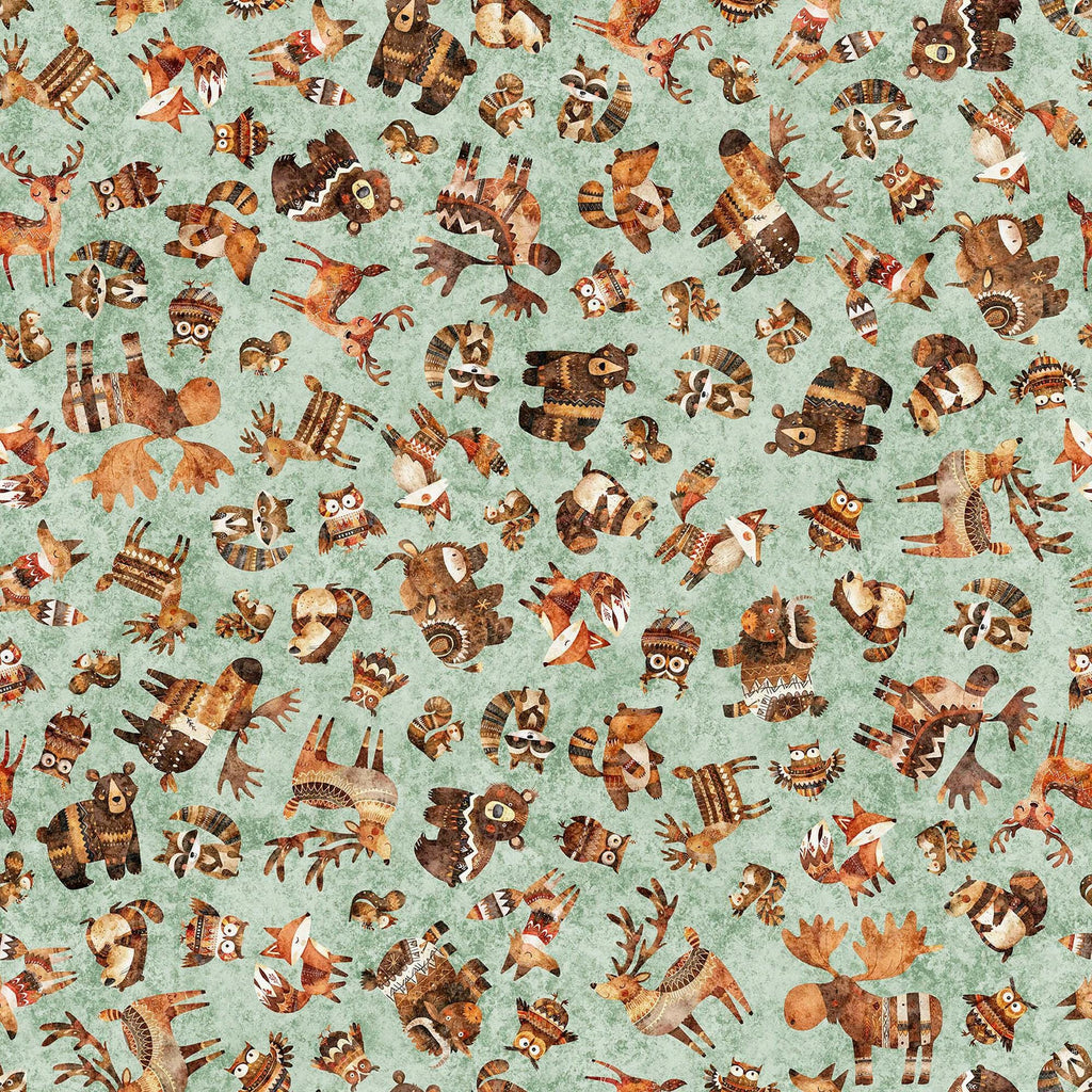 Bearsville Woodland Toss 31261 Sage H - QT Fabrics - Animals Owl Moose Squirrel Racoon Bear - Quilting Cotton Fabric
