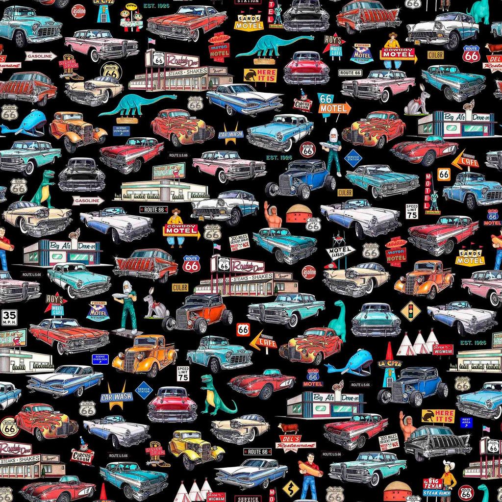 Get Your Kicks 2026 Route 66 Classic Cars And Icons Black by QT Fabrics 2600 31668 J