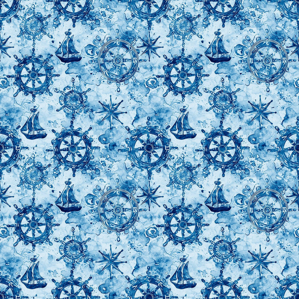 Ocean Blues Ship Wheels 30861 Blue B - by QT Fabrics - Water Sea Compass Navigation - Quilting Cotton Fabric