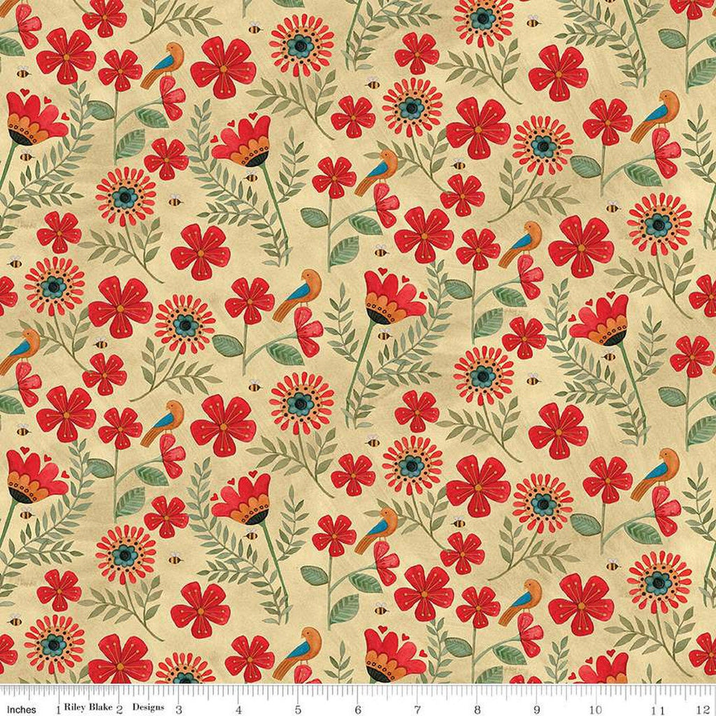 Stitchy Birds Flowers C12601 Parchment by Riley Blake Designs - Sewing Folk Art Floral Bees - Quilting Cotton Fabric