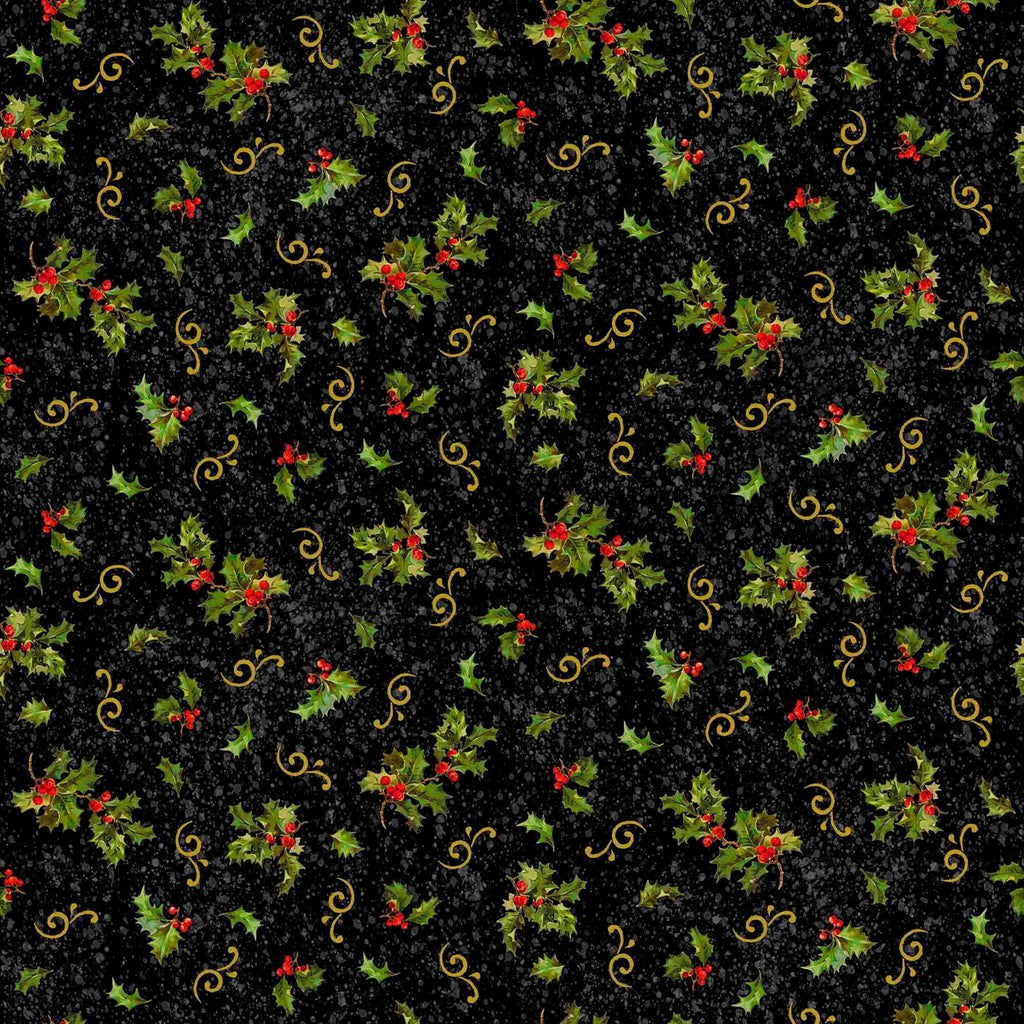 Poinsettia Greetings Holly & Scroll 31084 Black J - by QT Fabrics - Christmas Holiday Season - Quilting Cotton Fabric
