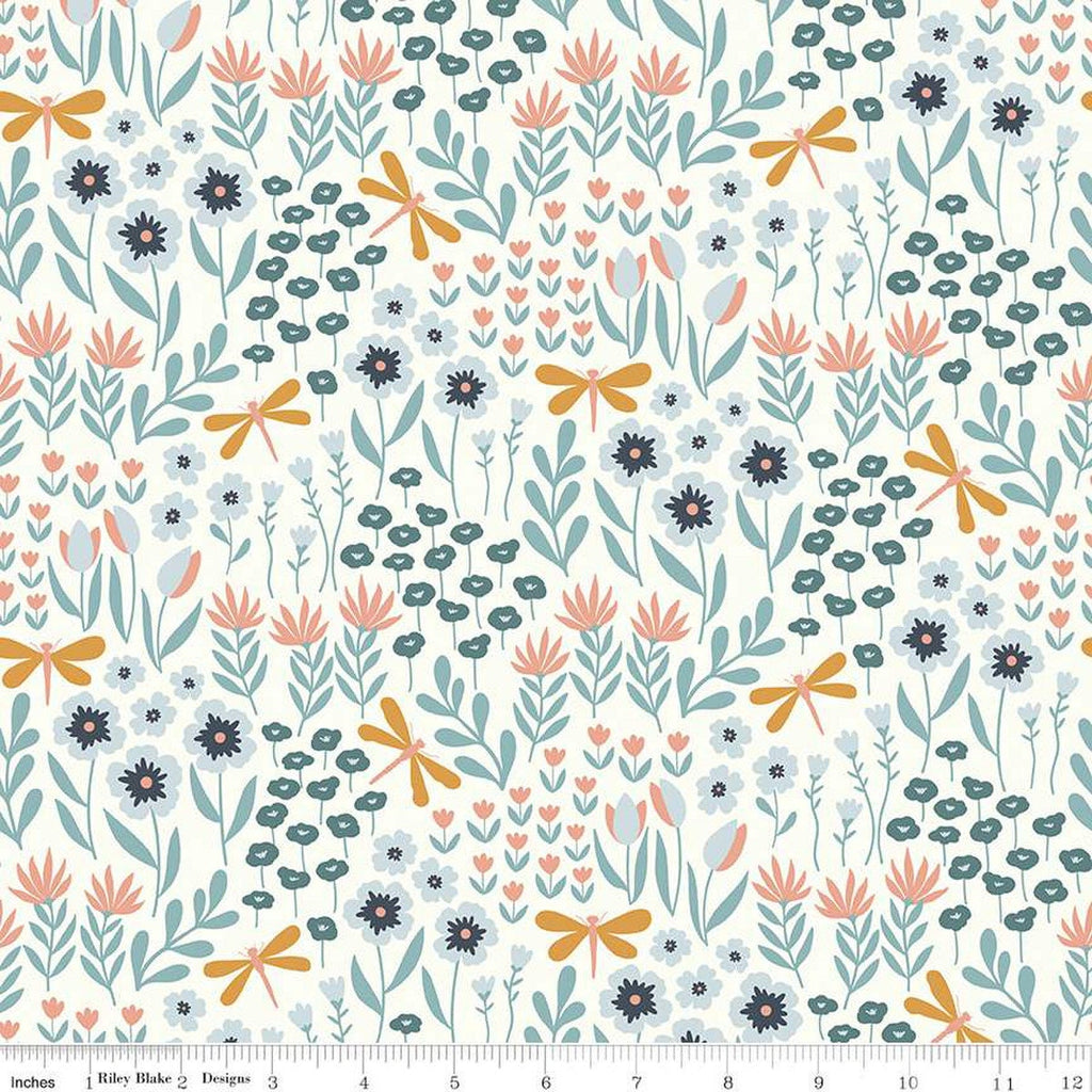 31" End of Bolt - SALE Little Swan Lakeside Floral C13741 Cream by Riley Blake - Flowers Dragonflies - Quilting Cotton Fabric
