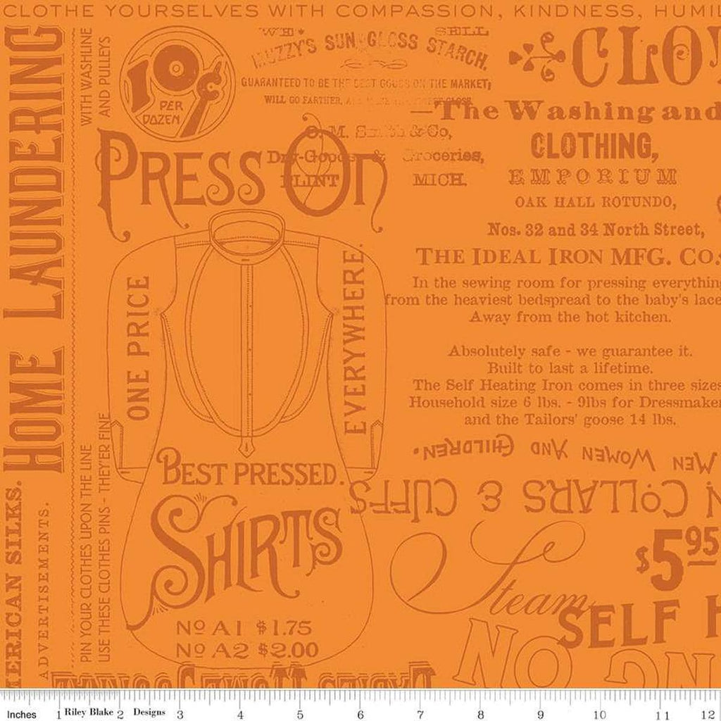 CLEARANCE Press On Pressing Matters C15259 Orange - Riley Blake Designs - Vintage Text Words - J. Wecker Frisch - Quilting Cotton Fabric