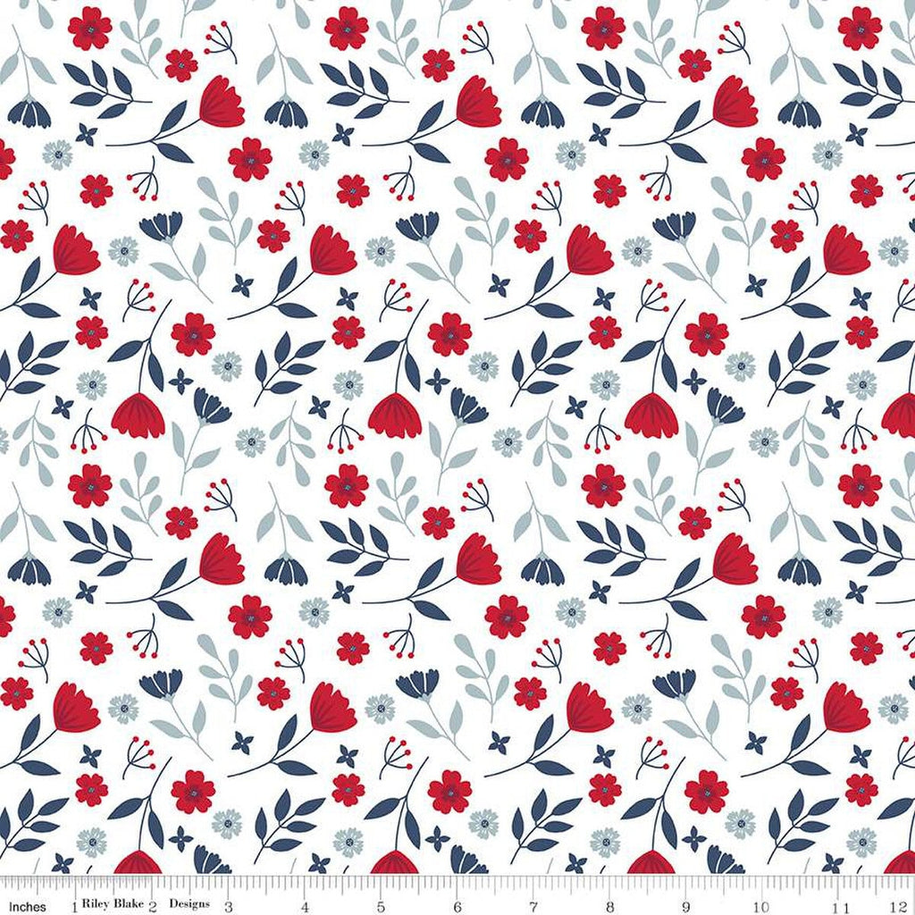 Fat Quarter End of Bolt - American Beauty Floral C14441 White by Riley Blake Designs - Patriotic Leaves Flowers - Quilting Cotton Fabric