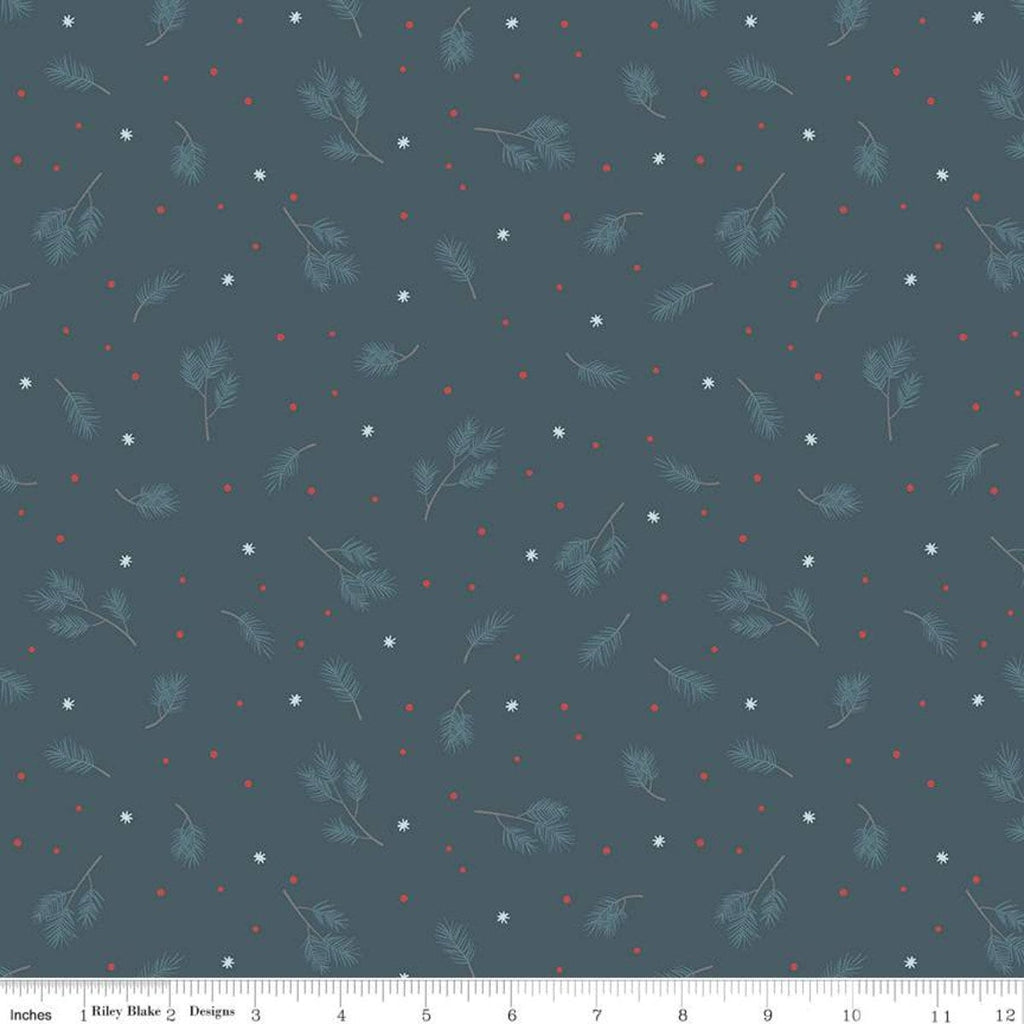 Fat Quarter End of Bolt - SALE Winterland Spruce C10711 Midnight - Riley Blake - Pine Sprigs Snowflakes Dots Blue - Quilting Cotton Fabric