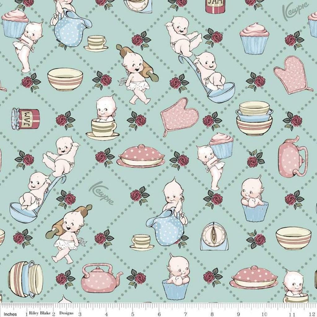 SALE Sew Kewpie Kooks C10541 Songbird - Riley Blake Designs - Cooking Cooks Pies Timers Teapots Vintage Blue Green - Quilting Cotton Fabric