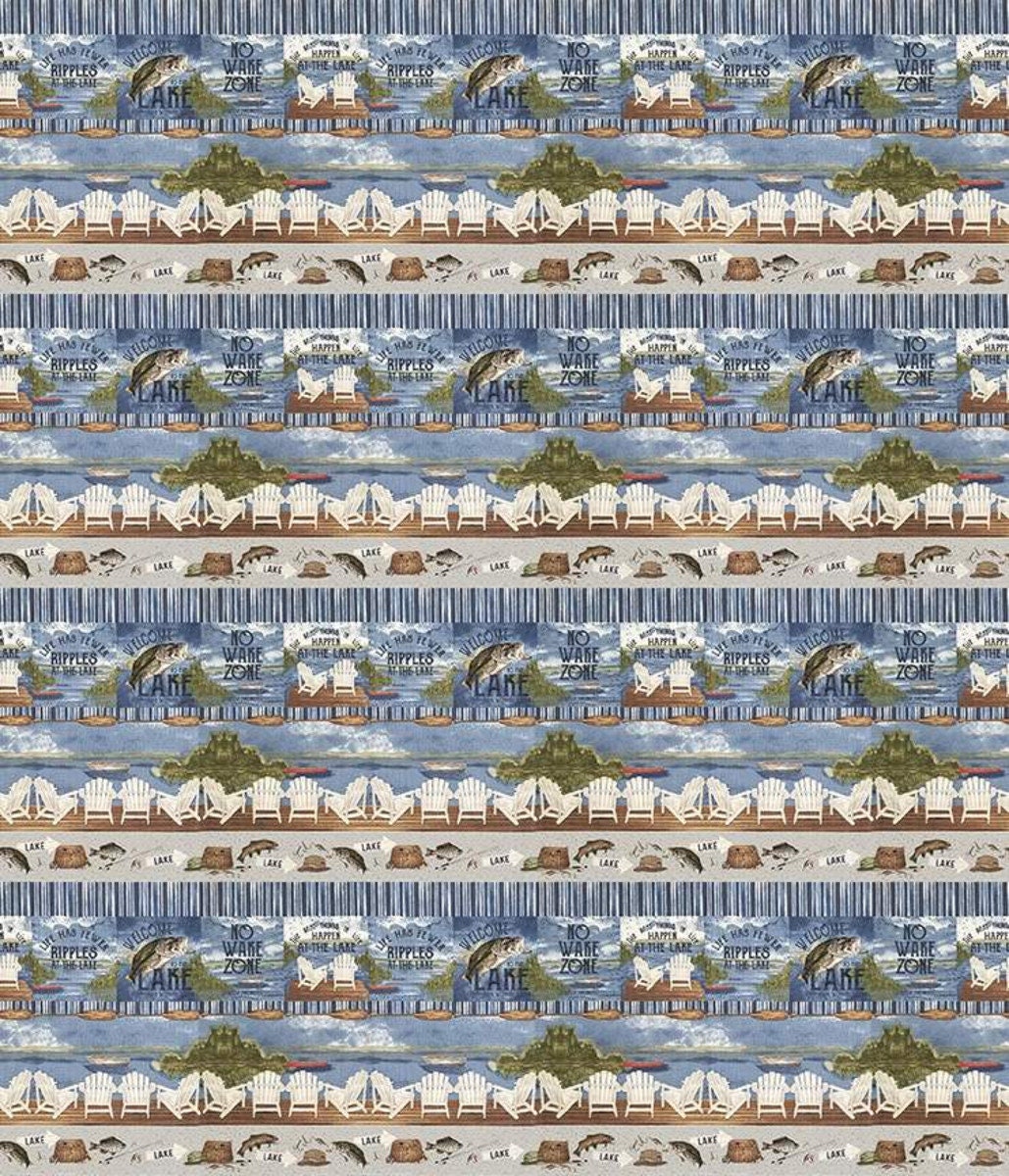 SUPER DEAL! 21" End of Bolt - At the Lake Border Stripe C10555 Blue - Riley Blake Designs - Posters Fish Fishing Gear - Quilting Cotton