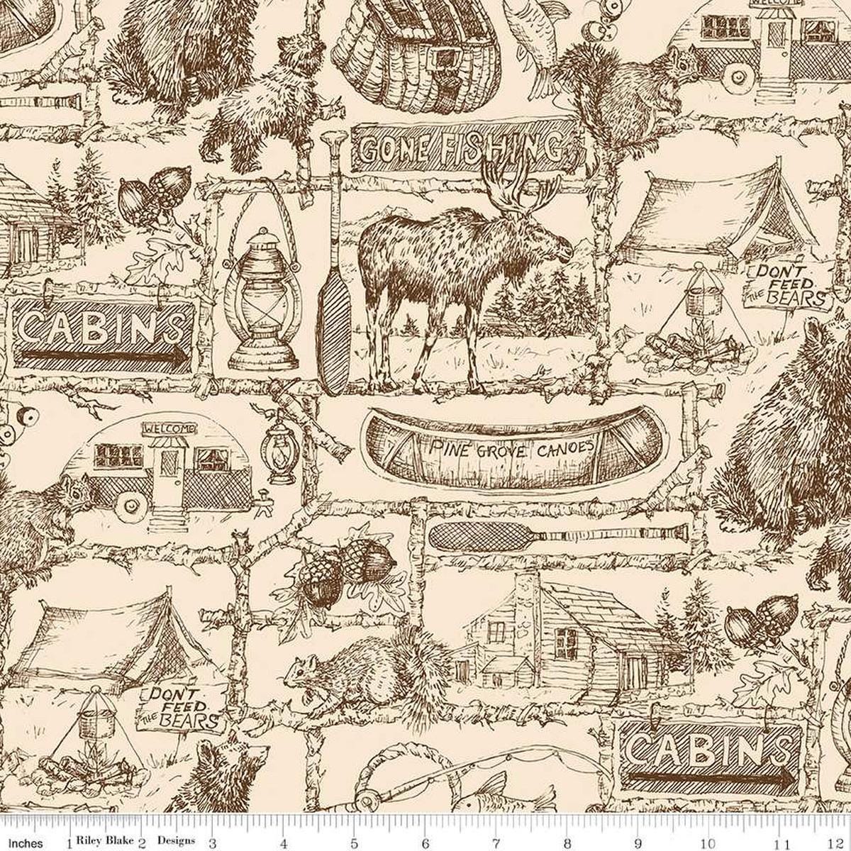 3-Yard cut- Pine Grove Outlines WIDEBACK WB15938 Putty - Riley Blake - 107/108" - Outdoors Icons Text - Quilting Cotton Fabric