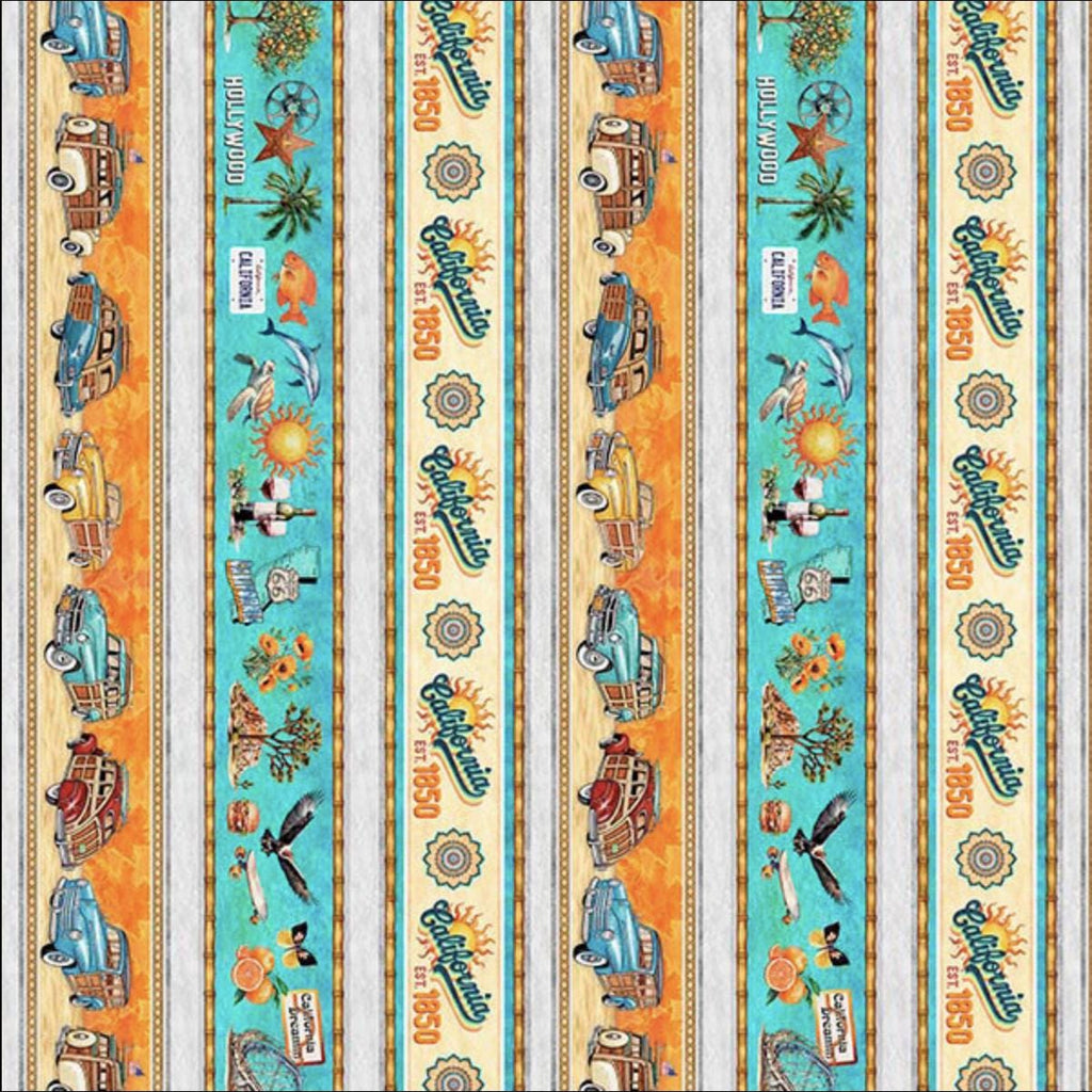 California Dreaming California Border Stripe 31345 Multi X - by QT Fabrics - Cars Sun Summer Flowers - Quilting Cotton Fabric