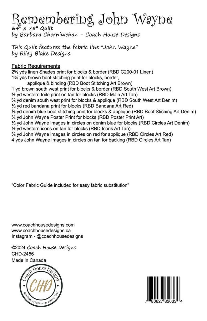 SALE Remembering John Wayne Quilt PATTERN P250 by Coach House Designs - Riley Blake Designs- INSTRUCTIONS Only - Licensed Product - Applique