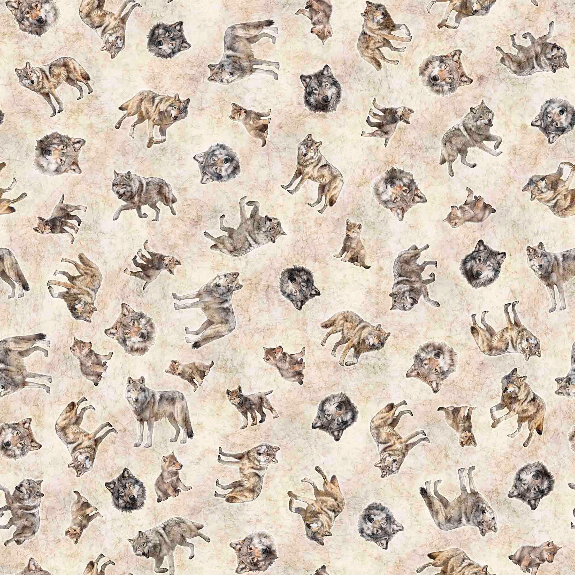 DEAL Running With The Pack Tossed Wolves 31101 Cream E - - QT Fabrics - Wolf Outdoor Animals - Quilting Cotton Fabric