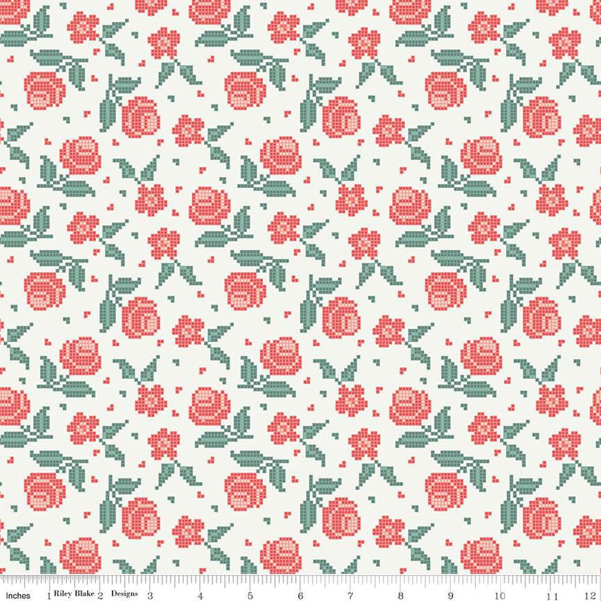 DEAL Afternoon Tea Stitched Flowers C14033 Sand - Riley Blake Designs - Floral Pixelated Flowers - Quilting Cotton Fabric