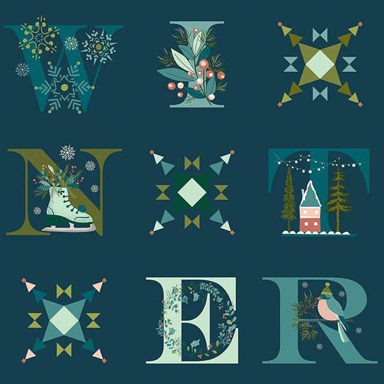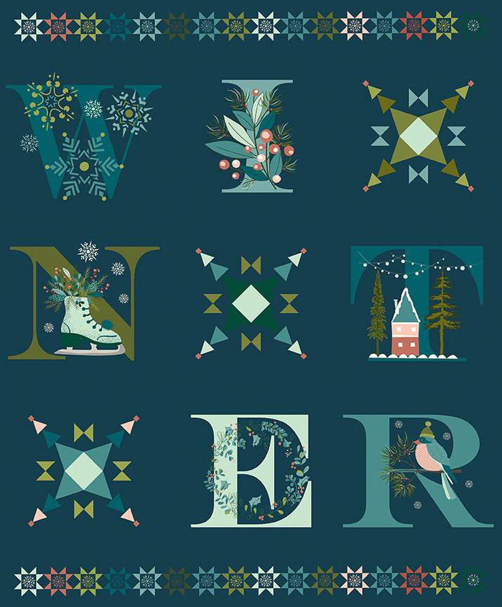 DEAL Arrival of Winter Panel P13529 Navy - Riley Blake Designs - Letters Icons Snowflakes Skates Bird House - Quilting Cotton Fabric