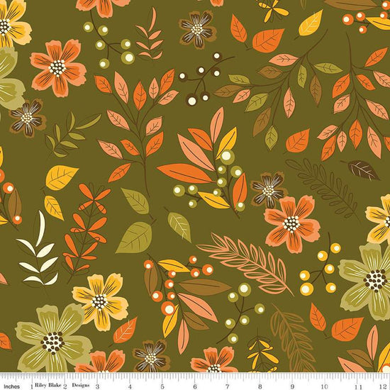 Awesome Autumn Main C12170 Olive - Riley Blake Designs - Fall Floral Leaves Flowers Berries - Quilting Cotton Fabric