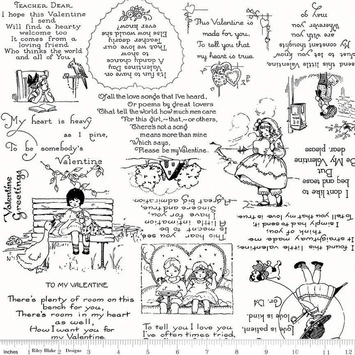 DEAL Be Mine Valentine Greetings C12783 Black - Riley Blake Designs - Valentine's Day Poems Vignettes on White - Quilting Cotton Fabric