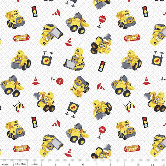 SALE CAT Junior Crew Toys C11472 White - Riley Blake Designs - Juvenile Construction Equipment Vehicles Tractors - Quilting Cotton Fabric