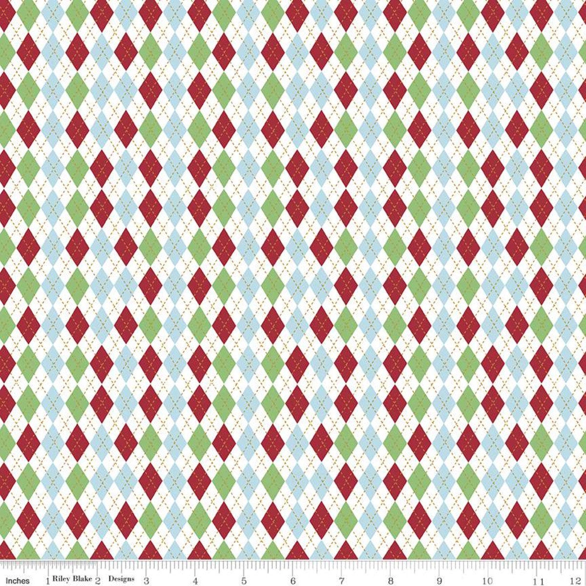DEAL Christmas Adventure Argyle SC10736 White SPARKLE - Riley Blake Designs - Gold SPARKLE Diamonds Blue Red White Green - Quilting Cotton