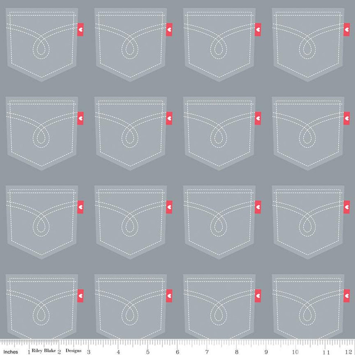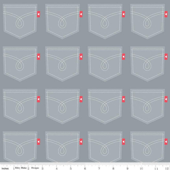 CLEARANCE FLANNEL Down on the Farm Pockets F10626 Gray - Riley Blake Designs - Pocket Stitching Heart Tag - FLANNEL Cotton Fabric