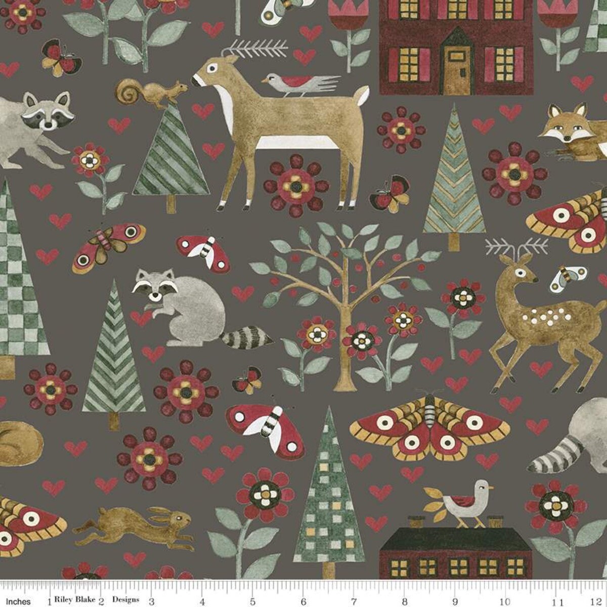 DEAL For the Love of Nature Main C11370 Gray - Riley Blake Designs - Folk Art Animals Trees Moths Houses - Quilting Cotton Fabric