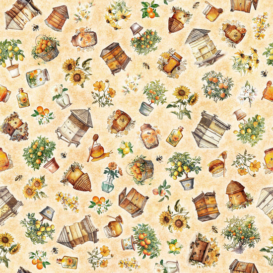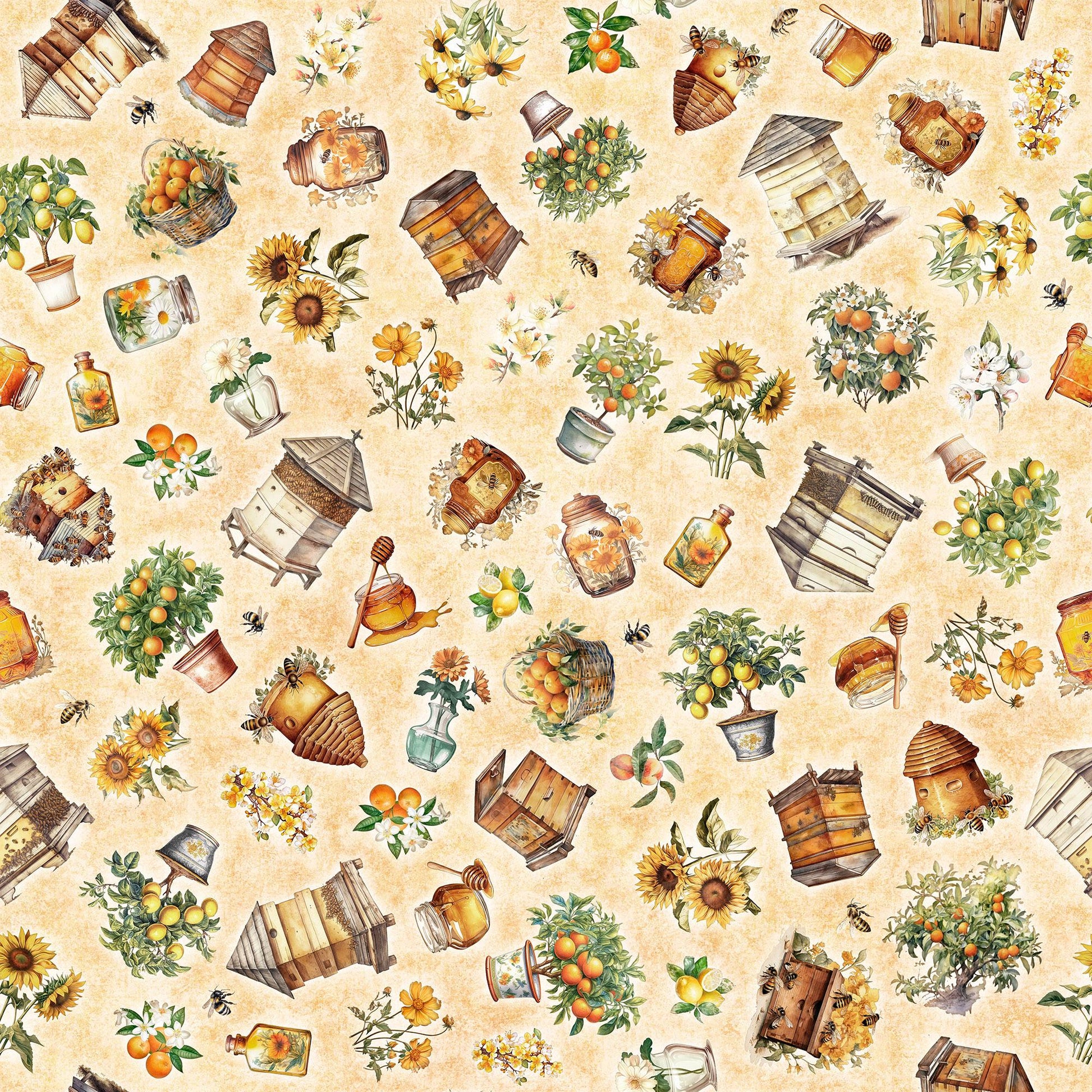 DEAL MINKY Queen Bee Bee Hive & Plant Toss 60" Wide 30485 Light Tan - QT Fabrics - Floral Flowers Bees Fruit Beehives - 100% Polyester