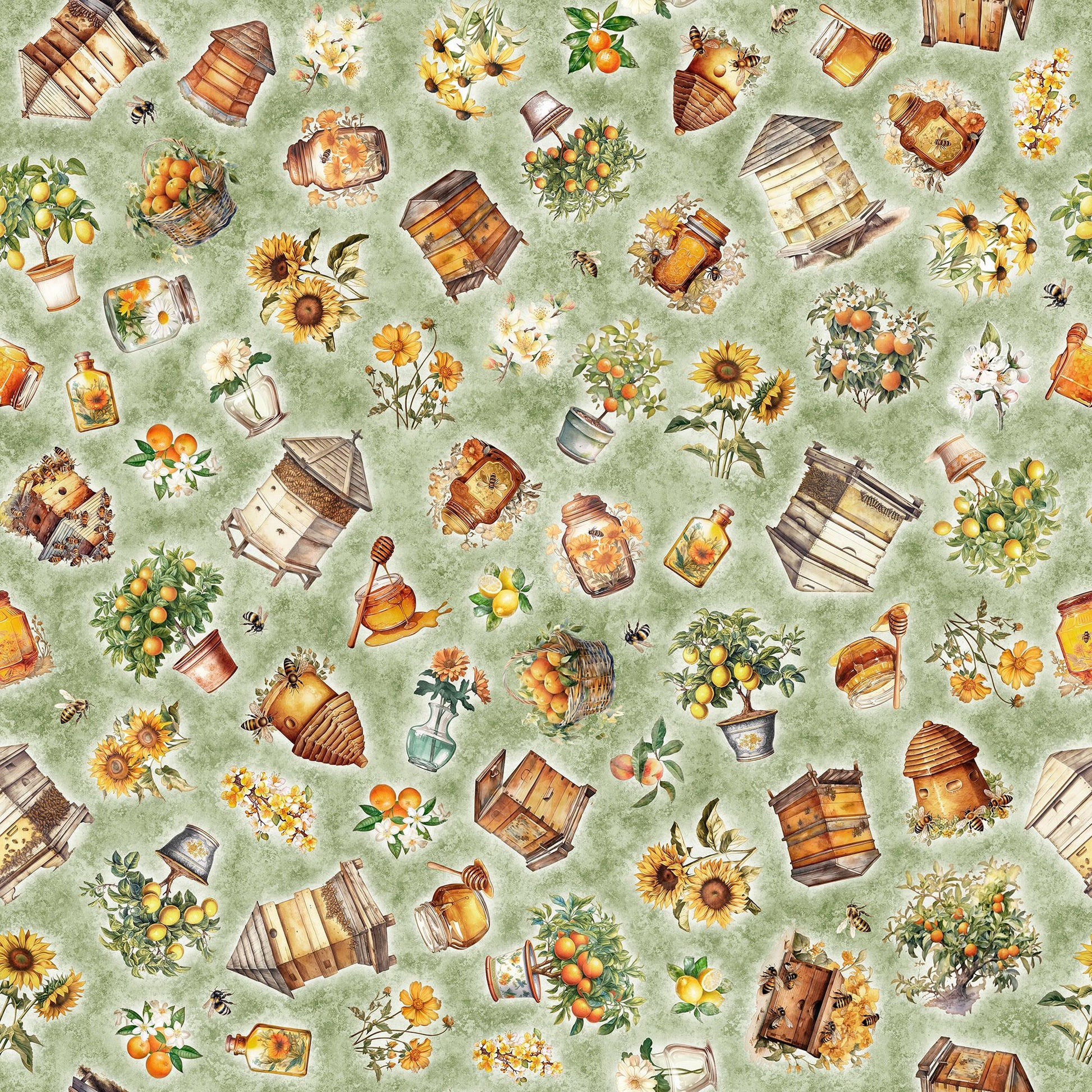 DEAL MINKY Queen Bee Bee Hive & Plant Toss 60" Wide 30485 Sage - QT Fabrics - Floral Flowers Bees Fruit Beehives - 100% Polyester