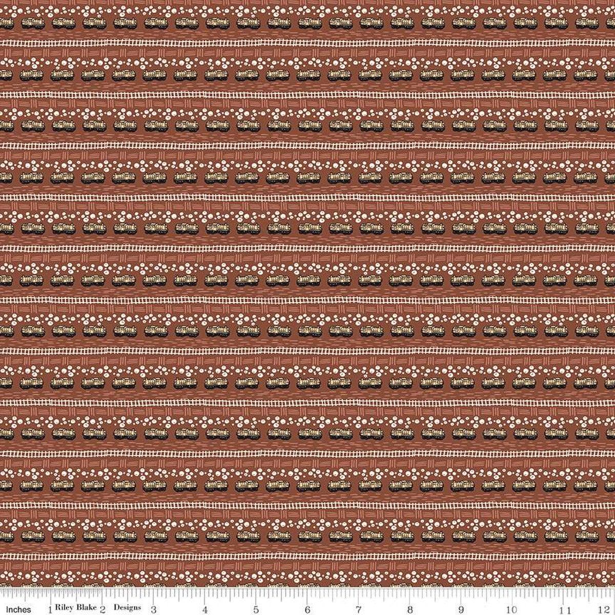 CLEARANCE 'Round the Mountain Bubble Convoy C13814 Rust - Riley Blake - Trains Locomotives Tracks Bubbles - Quilting Cotton