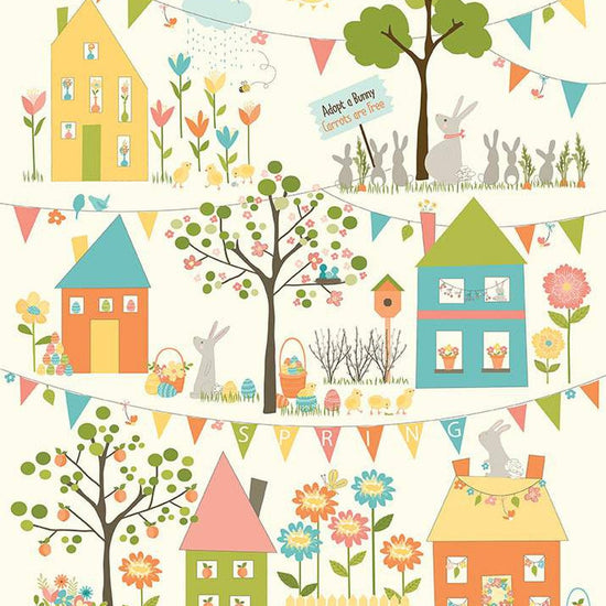 DEAL Spring's in Town Panel P14218 - Riley Blake Designs - Springtime Trees Flowers Houses Rabbits - Quilting Cotton Fabric