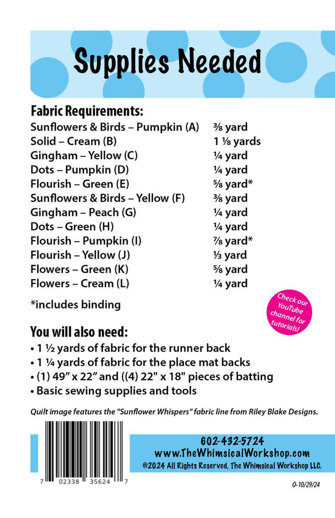 SALE Sunflower Charm Runner and Place Mats Quilt PATTERN P185 by The Whimsical Workshop - Riley Blake Designs - INSTRUCTIONS Only - Piecing
