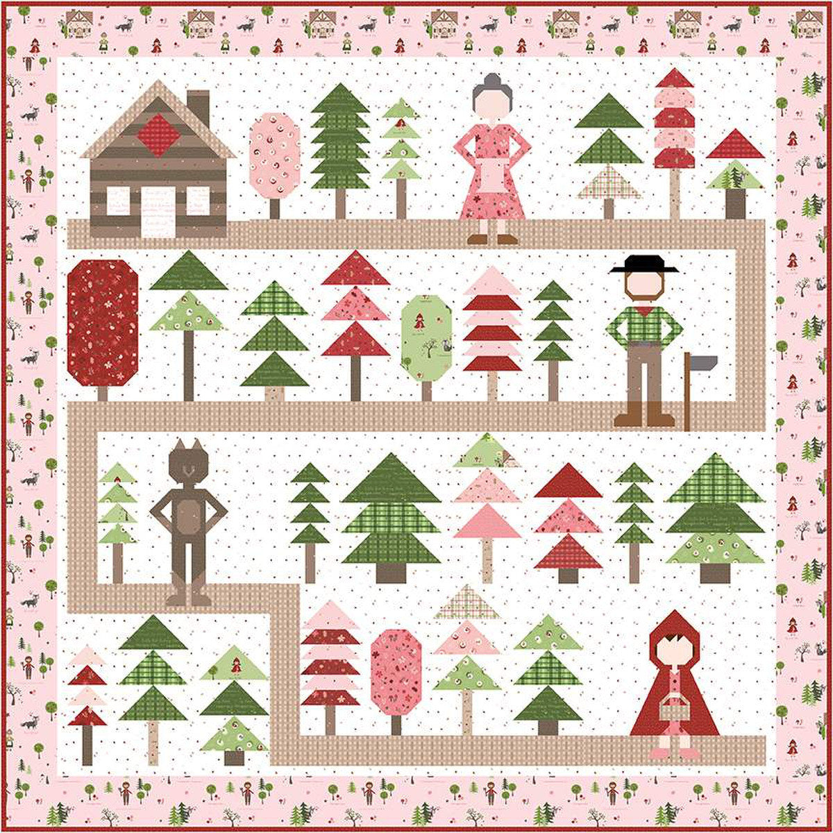 Features spiral bound instructions to make the Through the Woods Quilt. The quilt features the characters from Little Red Riding Hood on a path through the forest.
